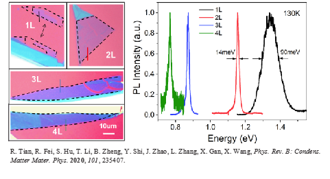 體相黑磷具有直接帶隙(0.3 eV),隨著層數(shù)減少,帶隙逐漸增大,單層帶隙寬度可達1.7 eV,且少層黑磷和體相黑磷帶隙隨溫度呈現(xiàn)不同溫度依賴關(guān)系。