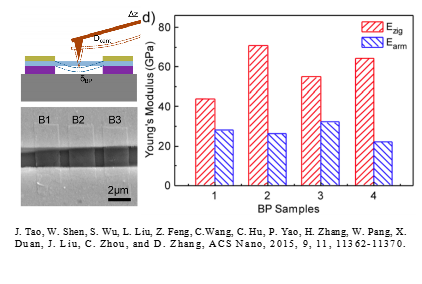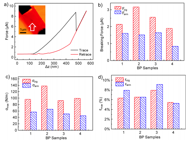 由于黑磷晶體結(jié)構(gòu)的不對稱性,其在光學(xué)、電學(xué)和力學(xué)等方面表現(xiàn)出獨特的面內(nèi)各向異性。例如,黑磷晶體在armchair和zigzag方向上,楊氏模量、斷裂應(yīng)變和電導(dǎo)率的比值分別為2.2,1.94和1.93。