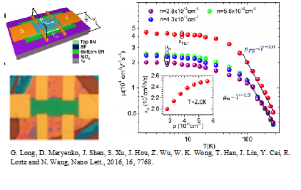 二維黑磷晶體場效應(yīng)晶體管具有超高且隨厚度可調(diào)的載流子遷移率。通過h-BN將黑磷包覆制備的場效應(yīng)晶體管,室溫和2 K低溫下其空穴遷移率可分別高達5200和45000 cm2/Vs。