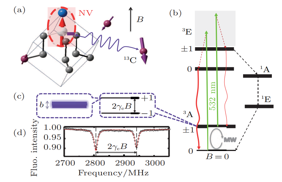 NV色心是金剛石中的一種發(fā)光點(diǎn)缺陷。一個氮原子取代金剛石中的碳原子,并且在臨近位有一個空位,這樣的點(diǎn)缺陷被稱為NV色心。由于NV的熒光非常穩(wěn)定,是一種良好的單光子源,被用于量子密鑰分配、生物熒光標(biāo)記等實(shí)驗(yàn)。NV色心的自旋可通過激光和微波實(shí)現(xiàn)操作和探測。另外由于NV的電子自旋相干時間可達(dá)毫秒量級,它被認(rèn)為是一種十分具有潛力的量子計(jì)算機(jī)系統(tǒng)。利用NV的量子寄存器、量子糾錯等實(shí)驗(yàn)被驗(yàn)證。同時NV也可作為納米尺寸的傳感器,用于磁場、電場、溫度等物理量的測量。得益于金剛石的光學(xué)微納加工工藝的日益完善,以金剛石為基礎(chǔ)的集成光學(xué)在NV色心的幫助下也正快速的發(fā)展著。而以化學(xué)氣相沉積制備的金剛石樣品的品質(zhì)越來越高,加之NV色心可通過離子束注入的靈活性,NV色心在將來必將得到越來越廣泛的應(yīng)用與關(guān)注。